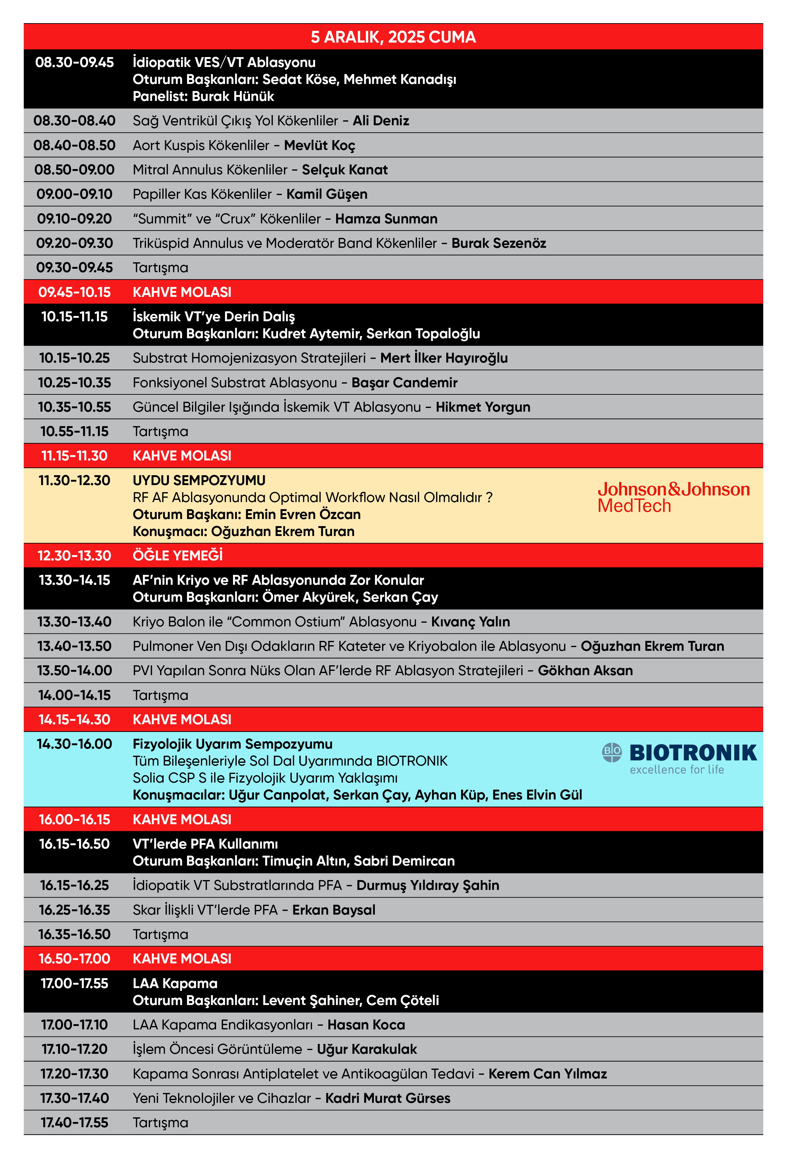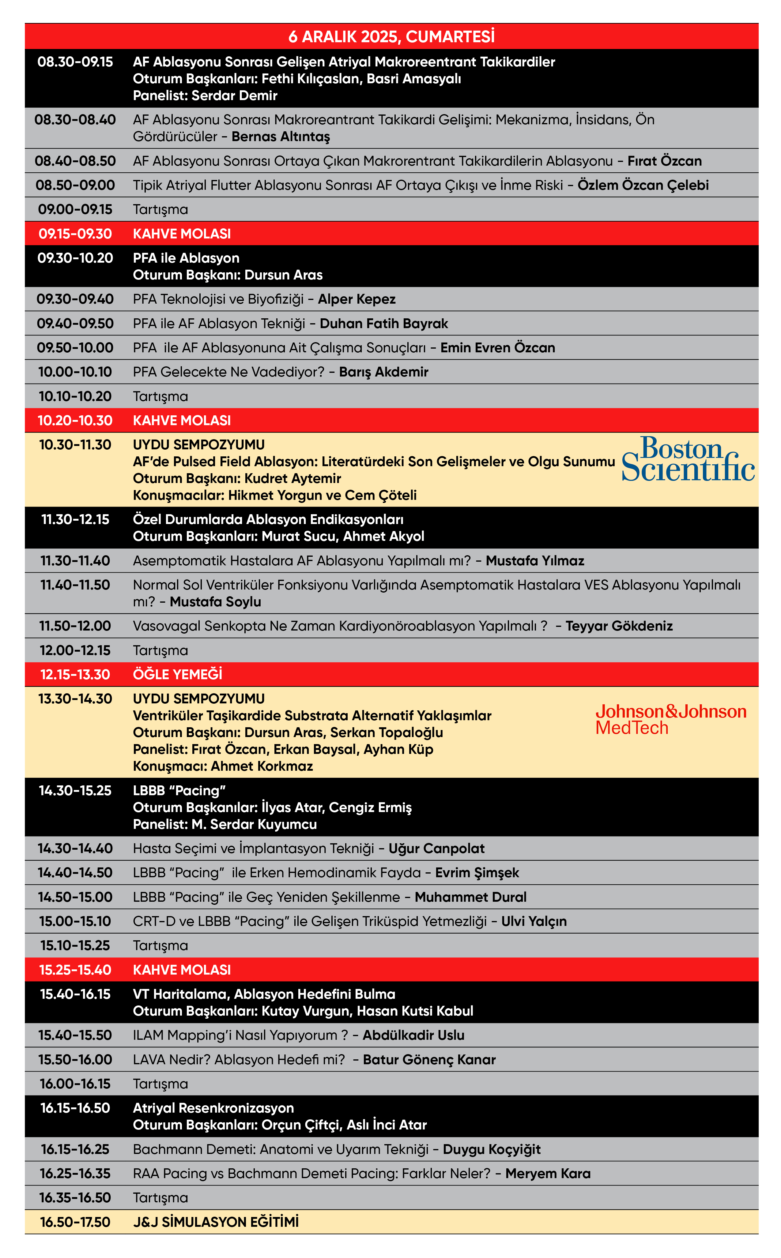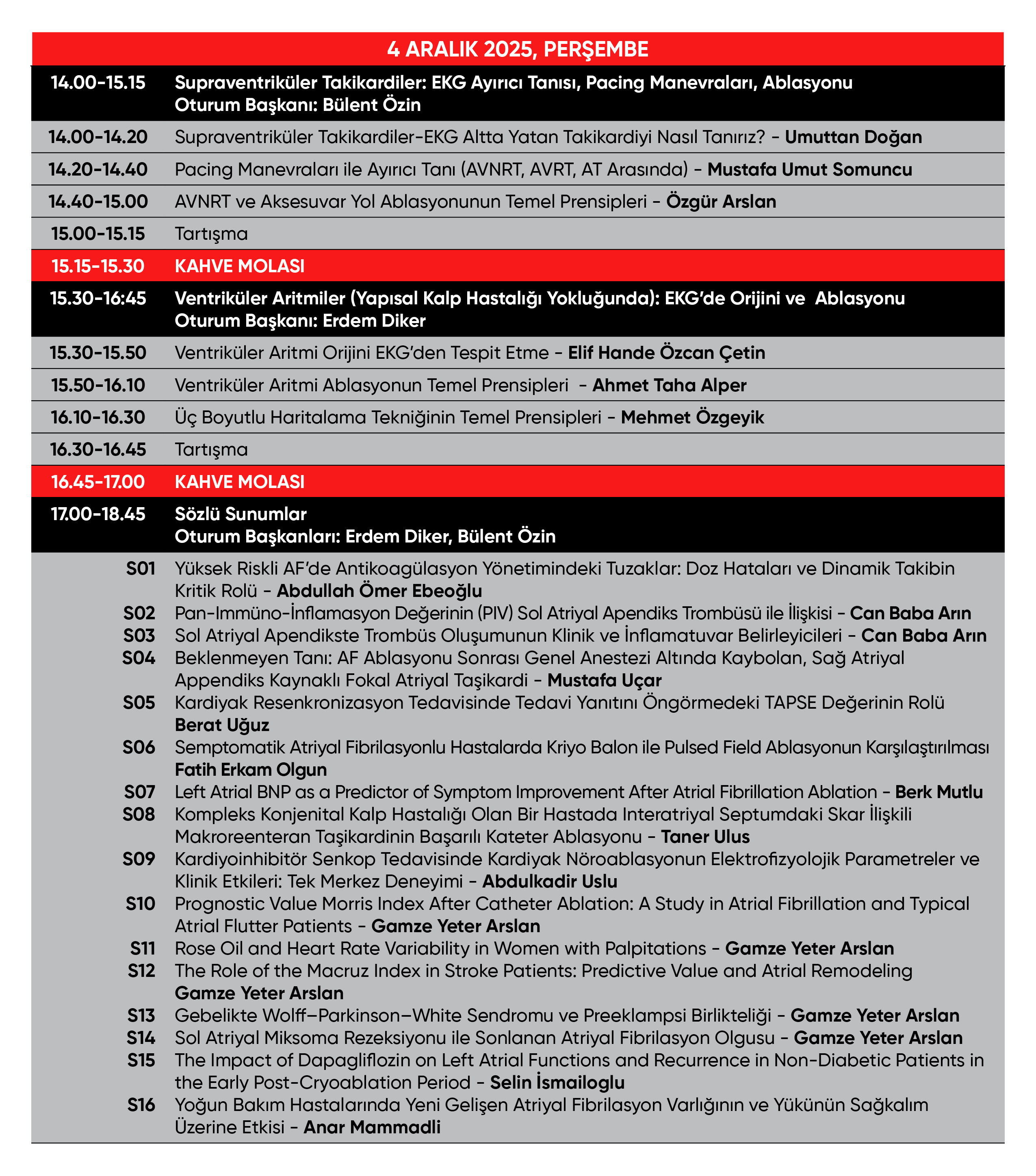 Atriyal fibrilasyon alanında son yıllarda önemli bilimsel gelişmeler yaşamaktayız. Bu yıl 4 - 6 Aralık 2025 tarihleri arasında 14. Atriyal Fibrilasyon Zirvesi’nde sadece atriyal fibrilasyon ile ilgili konuları bir kurs gibi birlikte tartışacağız. Yoğun programımızın hem çok öğretici hem de çok keyifli olduğunu düşünüyoruz. Bu vesile ile sizleri 4 - 7 Aralık 2025 tarihlerinde Antalya’da düzenlenecek olan 14. Atriyal Fibrilasyon Zirvesi 'ne davet etmekten büyük onur ve mutluluk duymaktayız.